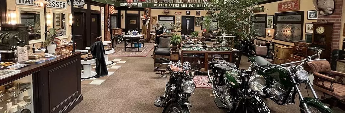 Ten niezwykły człowiek to założyciel firmy kosmetycznej Captain Fawcett, które umiejscowione jest w tym samym hangarze co muzeum. Bo wszystko tu się przeplata, zarówno elementy wystroju, artefakty i muzealne eksponaty, jak i historyczne książki tematyczne. Wszystko wystawione jest na widok publiczny wraz z produktami sprzedażowymi Captain Fawcett. Lubię taki miszmasz. Przypomina mi o latach 80., w których dorastałem i buntowałem się, a w których to artystyczna wizja punkowej estetyki przejawiała się w liczbie gadżetów na metr kwadratowy. Jednakże, nieporównywalnie do subkulturowego zacięcia, hala wystawowo-muzealno-filmowa w muzeum barberskim Finneya jest zorganizowana z wyjątkowym smakiem. Ale po kolei.